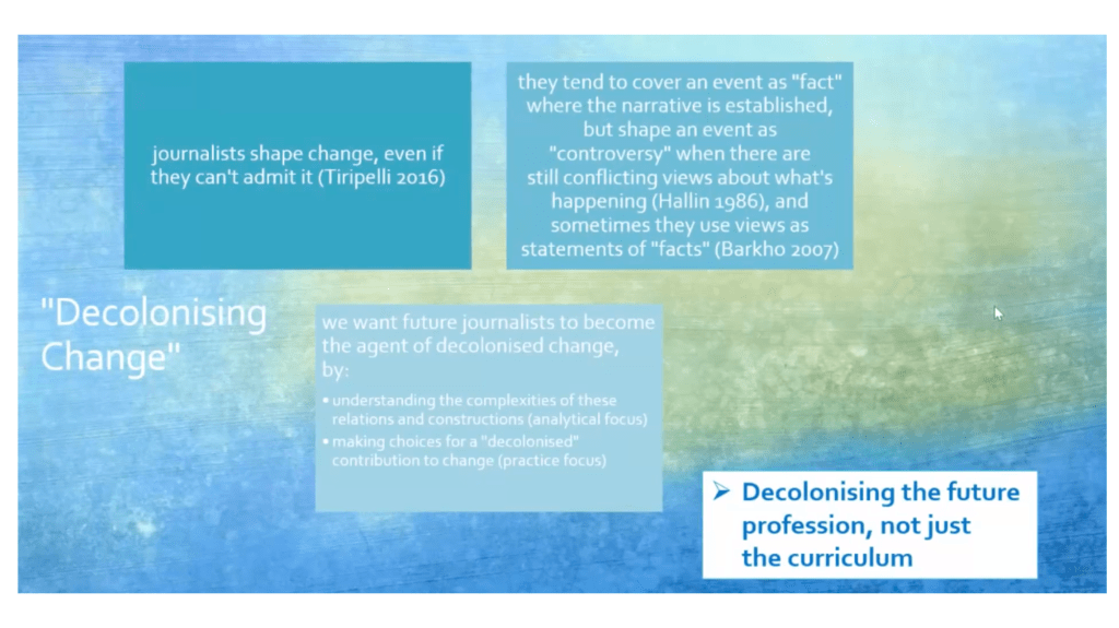 Dr Giuliana Tiripelli and Dr Gurvinder Aujla-Sidhu presented the results of their work on decolonising the curriculum of journalism through peace journalism practice at DMU, for the Future of Journalism conference (23 September). This paper illustrated the approach developed in the modules of the new journalism programme led by Gurvinder.
